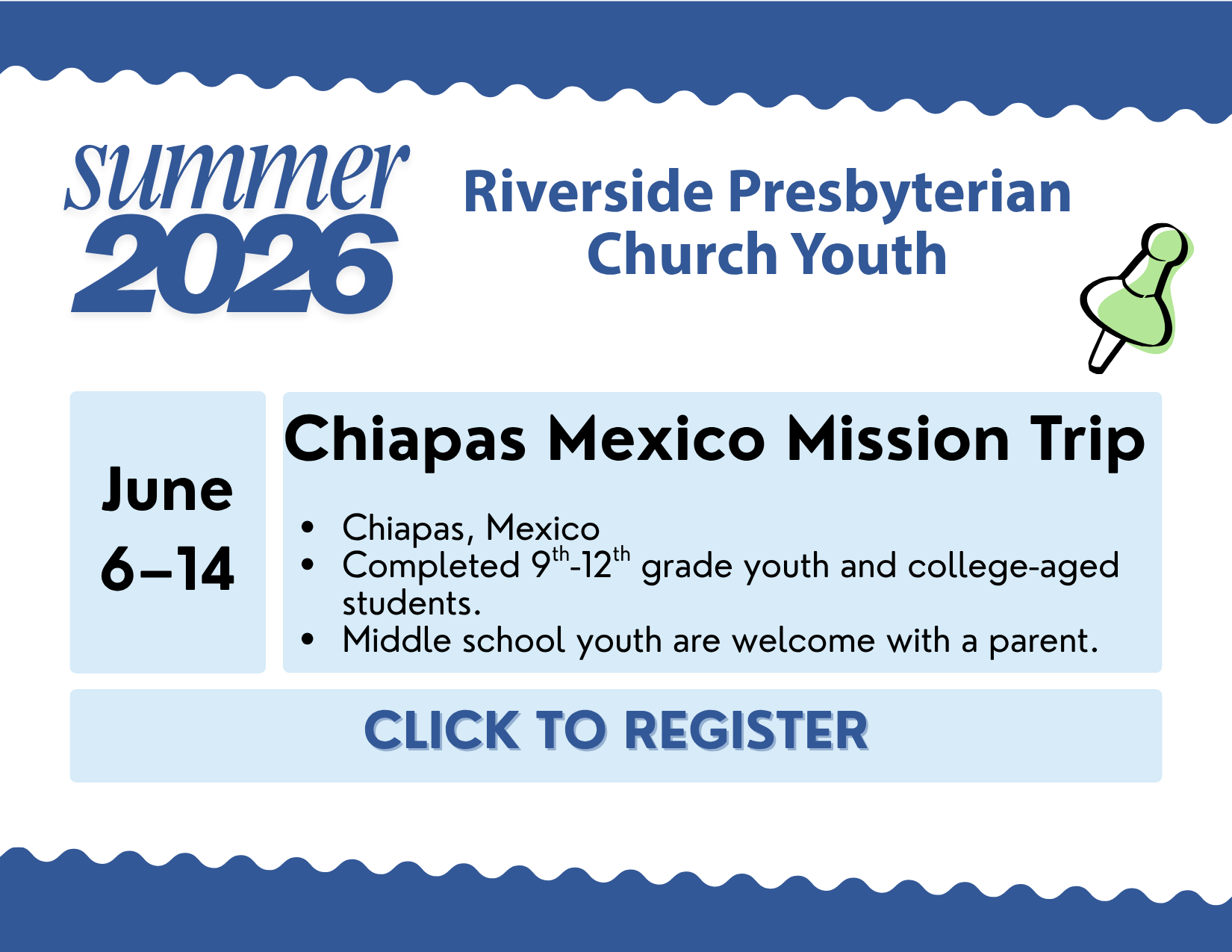 Riverside's ministry with youth (Middle and High School) is part of a continuum of nurture from birth into adulthood. It includes transitional experiences for fifth-graders as they approach early adolescence and extends into and beyond college years.