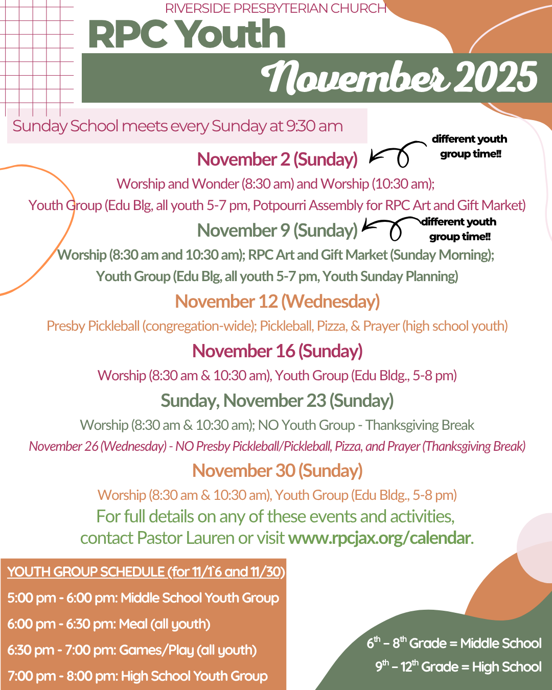 - 5:00 pm - 6:00 pm: Middle School Youth Group